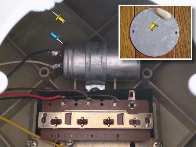 最初、丸いフタ(右上の画像)をはずしたとき、開かないように固定してあるのかと思ってたら、どうやらコンデンサから漏れた液体(ロウみたい)が冷えて固まったらしい。本体側にもついてる(黄色いピンのところ)。