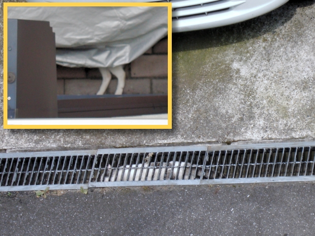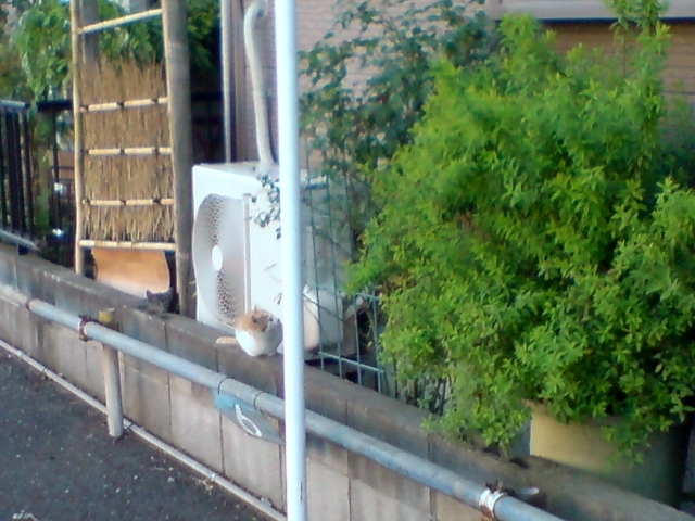 この家の人はネコがスキなのか、エアコンの室外機の左に写ってる目かくしの下に、いかにもネコ用なペロンとめくれる扉がつけてある。