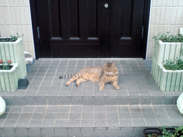 近くで見ると、かなり黒っぽい色のキジトラで、ナオやケンみたいにカギしっぽぢャなくてまっすぐ。