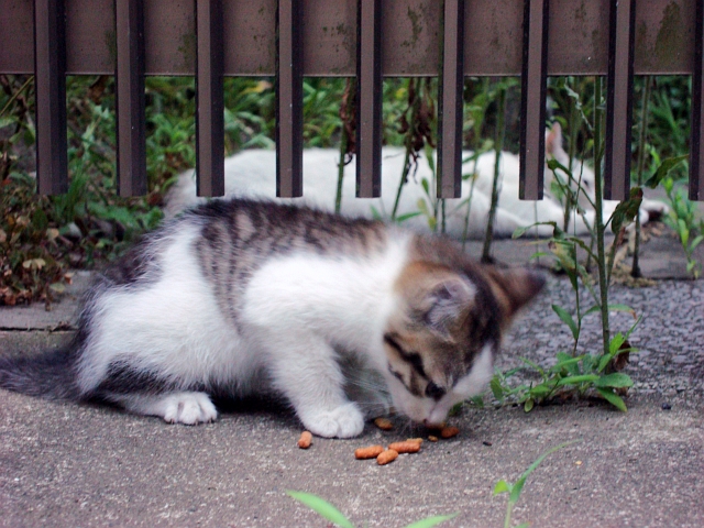 ケンゾーがオレの近くにいるときに遊びにきて、はなれたところでミーミー鳴いてるから、ケンゾーが近づかないように気をつかいながらエサをあげた。