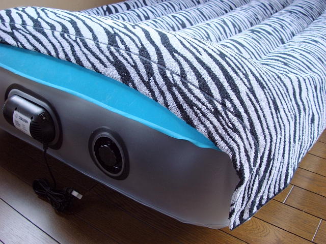 敷いてみたら、いいカンジ。エアーベッドの表面がベロア調になってるから、タオルケットがぴったり貼りついてぜんぜんズレない。