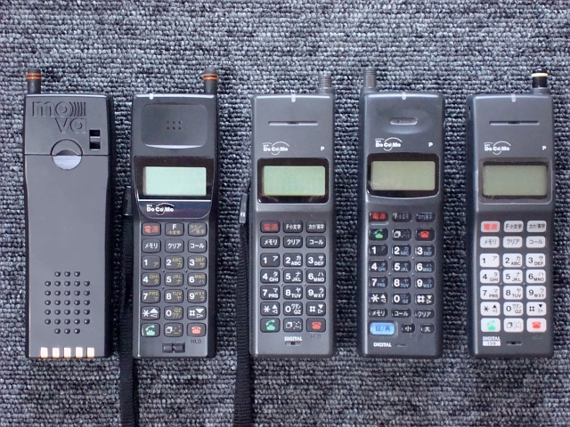 左から、アナログ「mova P」(裏/表)・「デジタルmova P」「デジタルmova PⅡ」「デジタル(1.5G)mova P」。