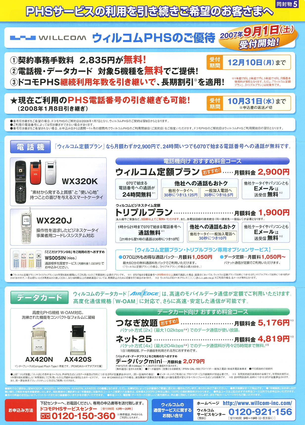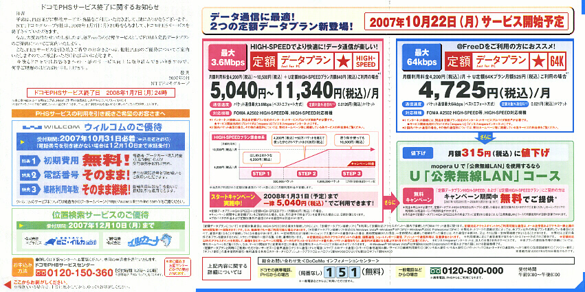 また2007年9月1日より、DoCoMoを解約してWILLCOMを契約する場合の優待申し込み(限定機種無料)・現在と同じPHS電話番号を2008年1月8日以降WILLCOMのPHSサービスに引継いで利用できるとしている。