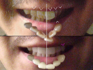 ■2回目:先週とった歯型に、4本サンプルの歯がついていた。相談の上、上側(右側2番目)をあと1本追加。あと、左側の2番目と犬歯が、4番目の歯にラインをあわせて内側ぎみだったのを、右側の犬歯とほぼ対象に外側に出して欲しいと伝えた。さらに下左側の犬歯(下の白い<印)を右の犬とほぼ対象に外側に出すように追加してもらい、合計6本治療を行うことにした。歯の色は、もともとの色に合わせて作ってもらうことにした。