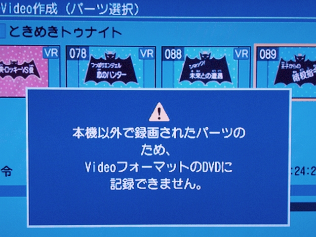 さらに、はじめて「本機以外で録画されたパーツのため、VideoフォーマットのDVDに記録できません。」って出た。