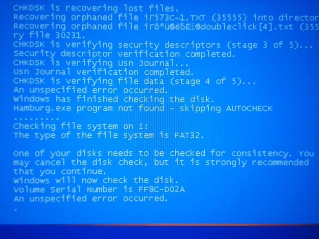 もう一度最初から始まったケド、前に書いたエラーチェックの時みたいに、「CHKDSK is verifying file data (stage 4 of 5)」の26%で引っかかって進まない。