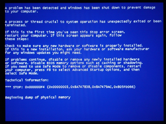「システムのプロパティ」の「起動と回復」で、自動で再起動しないように設定してストップエラーの画面を確認したら、「0x000000F4 (0x00000003,~,~,~)
